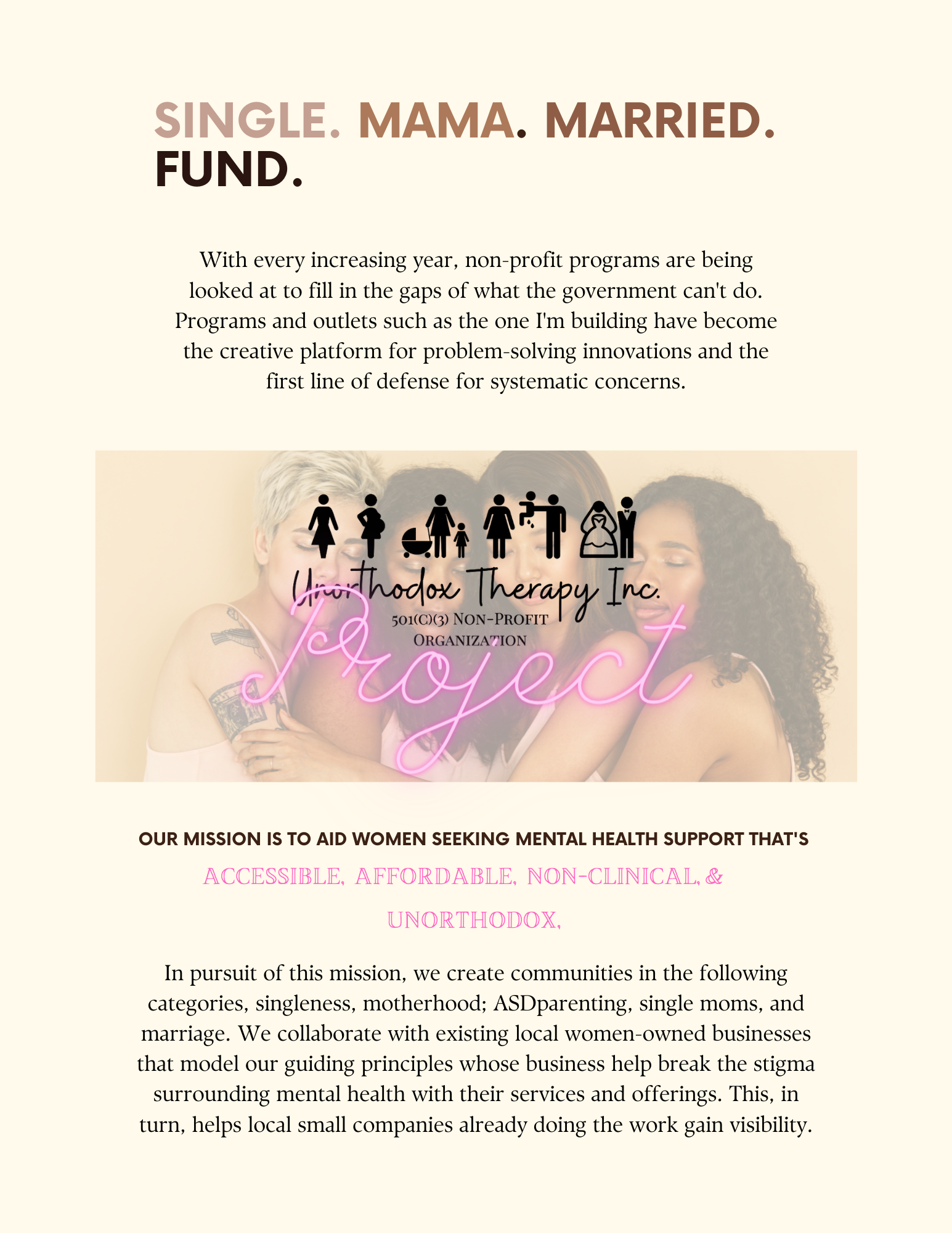 While we're in the beginning stages of production, 100% of the contribution will go towards local programs in major cities that aid women through mental health. In our endeavors to make Single Mama Married (an unorthodox therapy) a just community; We commit and aim to bring mental health and wellness across the country through our network. By growing this network of women-based wellness groups, keep in mind that the selected group and or events represent our rigorous guiding principles which will nourish our minds and spirits. That their brand models the behaviors and understands that real leadership is derived from the service of others and helps drive the healing concerning these four different seasons: Single Life, Motherhood, Single Motherhood, Marriage, and extension to ASD Parenting.
